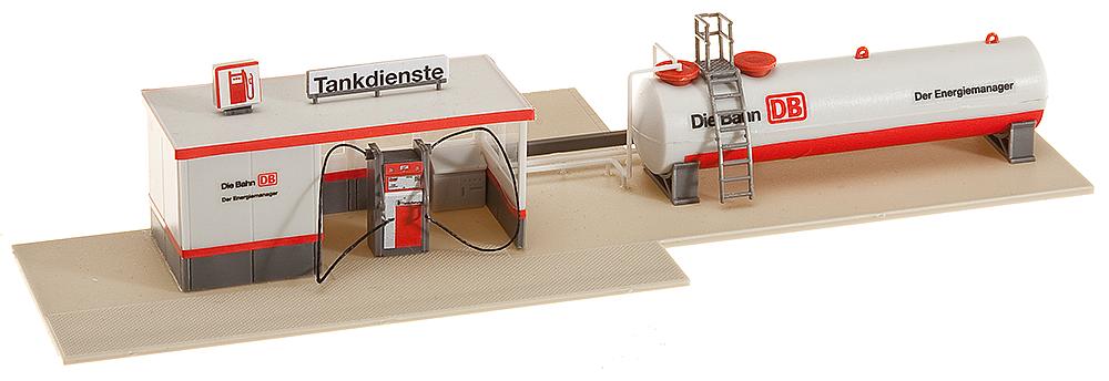 Neuzeitliche DB-Normtankanlage mit Öltank, Zapfsäule, Schaltkasten, Bodenteil und Service-Gebäude. Im Bahnbereich vielseitig einsetzbar. Dieser Bausatz enthält: 42 Einzelteile in 4 Farben, Fensterfolie, 1 Deko und 1 Bauanleitung.