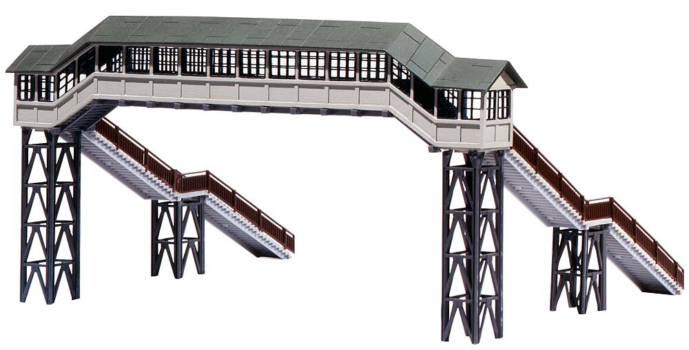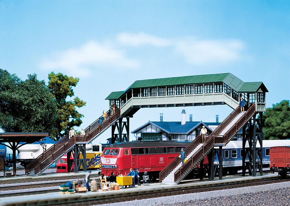 Mit offenen Treppenaufgängen und überdachtem, geschlossenen Fußgängersteg. In verschiedenen Formen baubar. Bis zu 4 Gleise überspannend. Dieser Bausatz enthält: 54 Einzelteile in 4 Farben, Fensterfolie und 1 Bauanleitung.