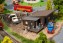 Großer Kohleschuppen in Holzbauweise mit beweglichen Toren zur Bahnseite und einem Pultdach. An den Stirnseiten wird das Lagergebäude flankiert von einem überdachten Außenlager und einem Büroanbau, der über eine kleine Terrasse betreten wird. Für die Szenengestaltung liegen ein Zaun, Schub- und Sackkarren, Fässer, Säcke und Kohle bei.
