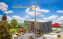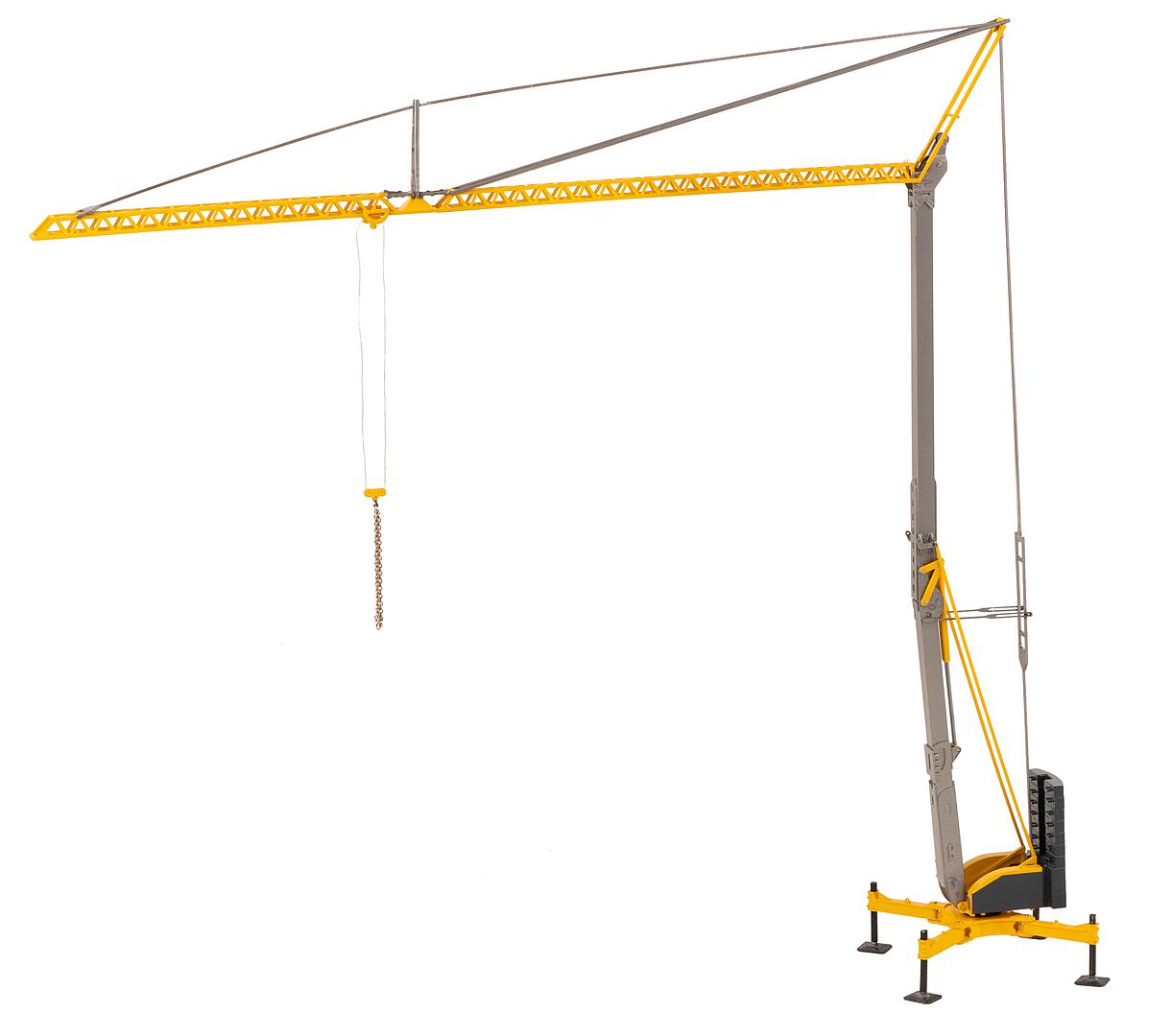 Im Hochbau! Schnellmontagekran, der auf Bauplätzen und Baustellen als Hebe- und Förderhilfe dient, bestehend aus einem Unterwagen mit ausklappbaren Füßen und Ballastgewicht, Kranturm und Ausleger.