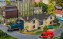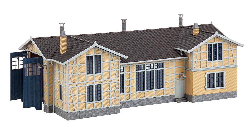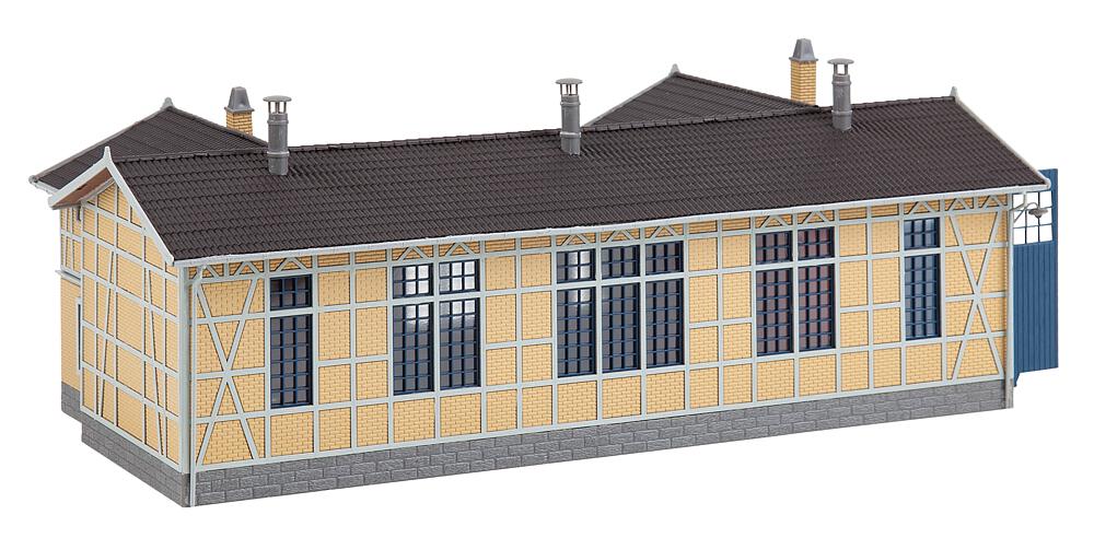 1-ständiger Lokschuppen in Fachwerkbauweise mit hellen Balken und gelber Klinker-Ausfachung. Der Lokschuppen bietet Platz für Loks bis 230 mm LüP.