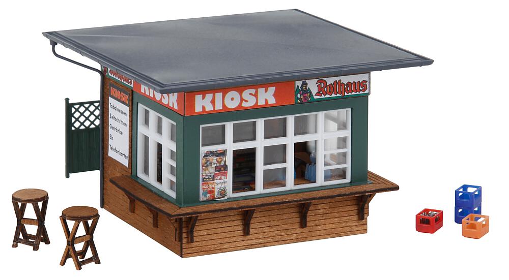 Verkaufsstand für Snacks und Getränke! Kiosk in Holz- und Kunststoffbauweise mit großen Fenstern und einem Flachdach. Die Holzkonstruktion besteht aus Lasercut-Teilen.