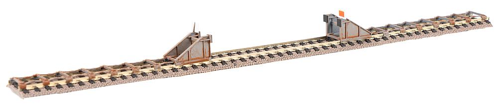 Gleisenden dauerhaft sichern. Zwei ortsfest verankerte Stahl-Prellböcke mit Scherenbremsen als zusätzliche Bremselemente verhindern das Abrollen an den Schienenenden. Modell ohne Funktion.