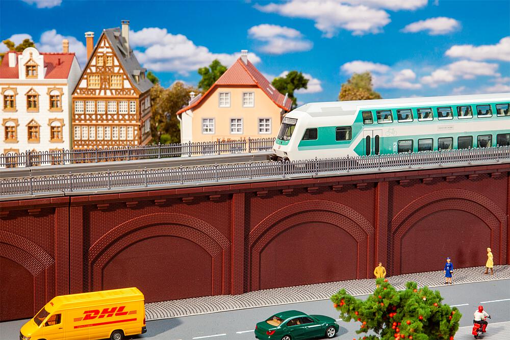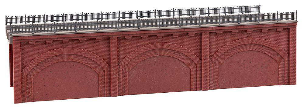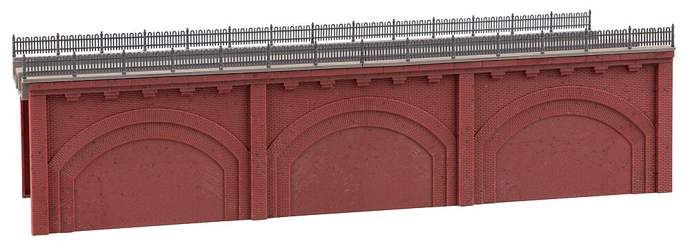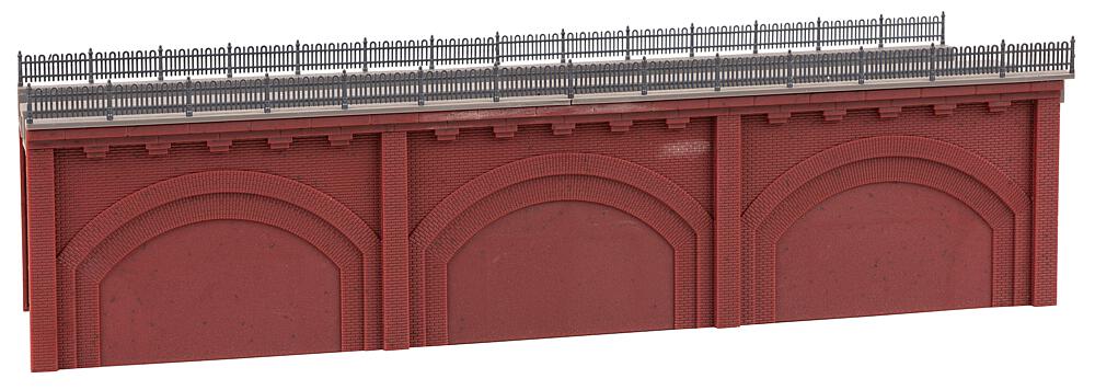 Nach dem Vorbild der Berliner und Wiener Stadtbahnbögen aus dem 19. Jahrhundert. Zweigleisiges Hochbahntrassen-Segment mit rötlicher Sichtziegel-Fassade und drei zugemauerten Viaduktbögen. Für alle Gleissysteme geeignet.