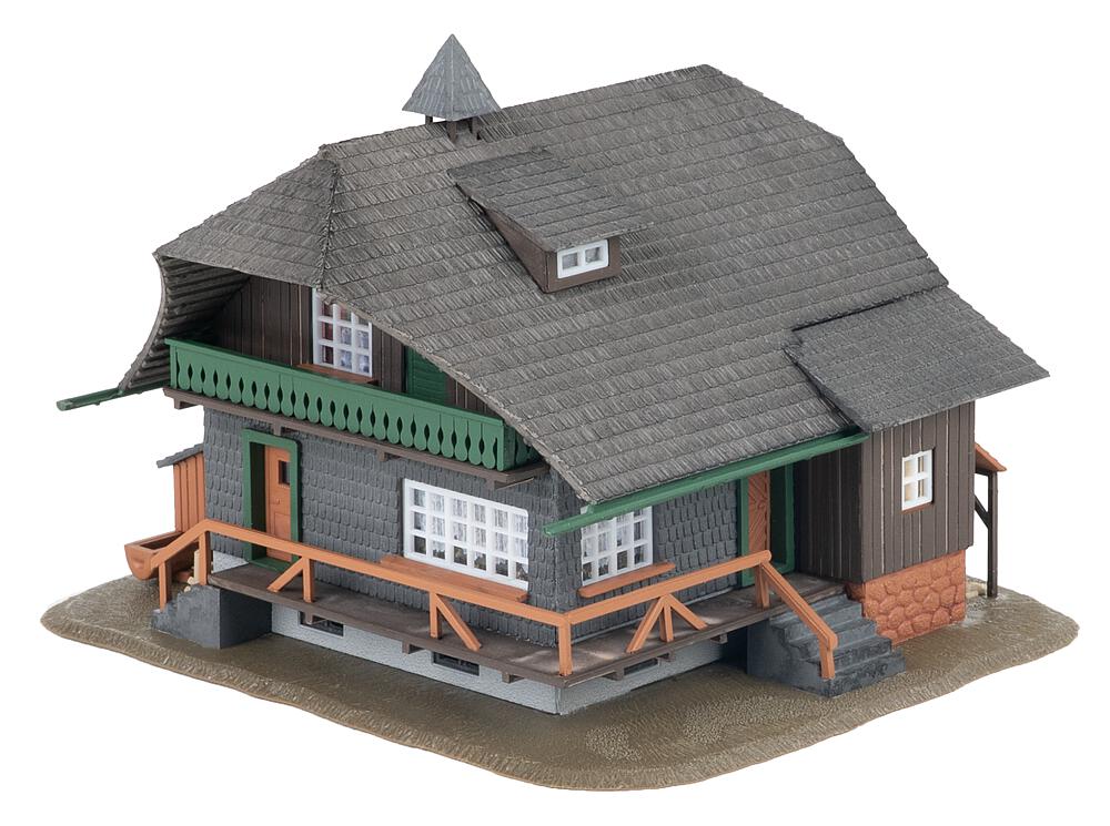 Tief aus dem Walde komm ich her! Dieser dunkle Schwarzwaldhof bringt den typischen Charme der Region direkt auf die Modelllandschaft. Grüne Farbelemente am Balkongeländer, helle Holzakzente und zahlreiche liebevolle Details machen ihn zu einem Blickfang auf der Anlage. Das weit herabgesetzte Dach ist ein unverkennbares Merkmal traditioneller Schwarzwald-Architektur und verleiht dem Modell seinen charakteristischen Charme. Eine passende Figur in Schwarzwaldtracht und Bollenhut haucht dem Ensemble zusätzlich Leben ein. Perfekt, um dunkle Nadelwälder und idyllische Landschaftsszenen stimmungsvoll auszuschmücken.