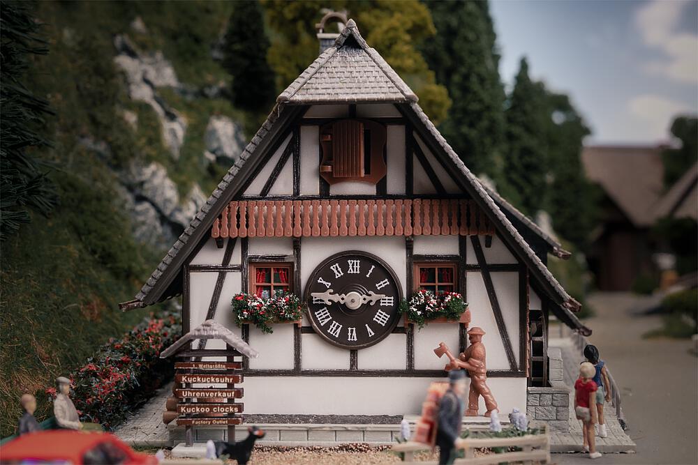 Dieses detailreiche Modell wurde nach dem Vorbild der weltgrößten Kuckucksuhr im Schwarzwald gestaltet. Das Original entstand im Schonacher Untertal, wo Uhrmachermeister Josef Dold und seine Familie in zweijähriger Arbeit ein einzigartiges Werk schufen - komplett aus Holz und mit einem Uhrwerk von gigantischen Ausmaßen. Das Modell fängt den besonderen Charme dieser außergewöhnlichen Sehenswürdigkeit ein: liebevoll gestaltete Details, Handwerkskunst und eine typische Schwarzwälder Tradition. Inklusive einer Figur in Schwarzwaldtracht und Bollenhut, die dem Ganzen zusätzlichen Charakter verleiht. Ein Stück Schwarzwald für Zuhause - inspiriert von der größten Kuckucksuhr der Welt. Das Modell ist mit einer Echtzeituhr ausgerüstet. Erforderliche AA-Batterie nicht enthalten. Das Wasserrad und der Holzhacker können mit dem »Synchron-Bastelmotor«,