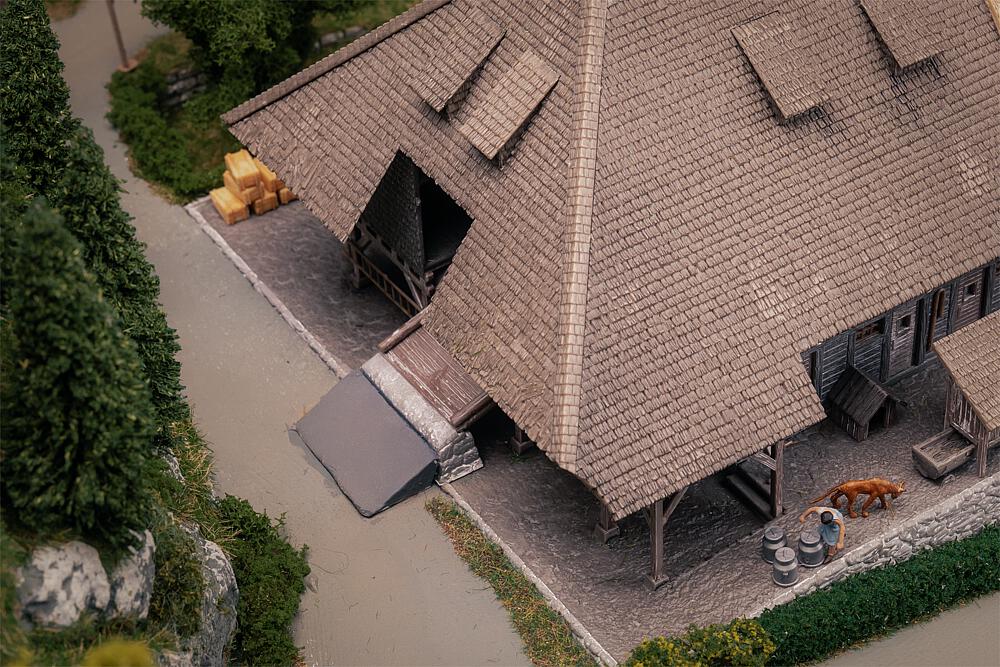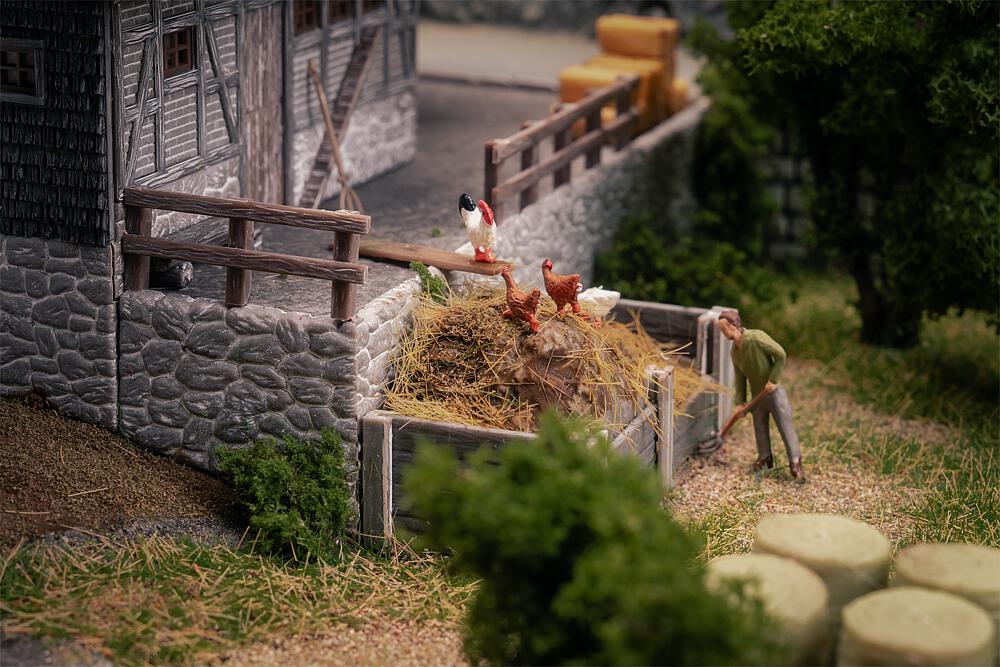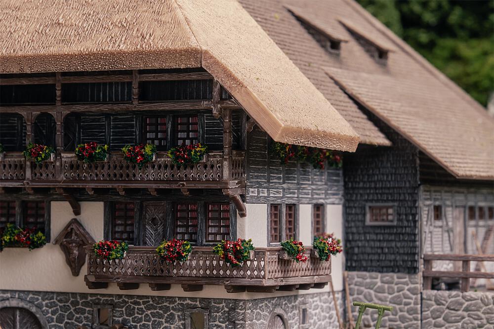 Ein echtes Wahrzeichen aus der Region! Ein stattlicher Schwarzwaldhof mit steinernem Kellergeschoss, Hocheinfahrt, Holzbalkon sowie Stroh- und Schindeldach. Zwei tanzende Figuren in Tracht bringen Leben auf den Hof und in die Modellwelt. Perfekt geeignet um die Waldlandschaft