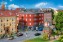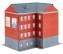 Vierstöckiges Stadteckhaus mit roter Klinkersteinfassade in den oberen Geschossen, weißen Fenstern und Dachgauben. Im Erdgeschoss mit Steinquaderfassade befindet sich ein Tattoostudio.