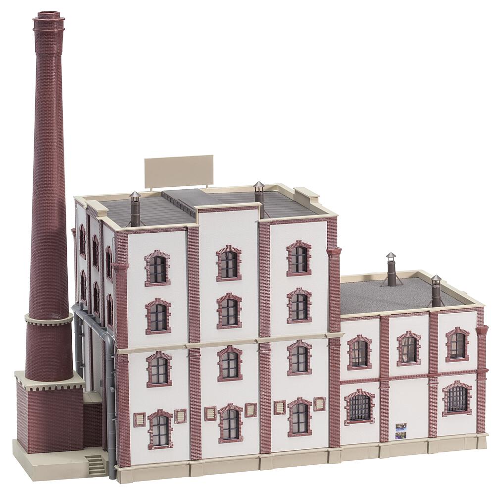 Weberei Riedmüller.Reizvolle Fabrikarchitektur. Teilverputzter Ziegelbau mit markant betonten Vertikalachsen und schlichtem Horizontalabschluss.Haupt- und Nebengebäude des Industriebaus mit den hohen Segmentbogenfenstern und dem seitlich angebauten Schornstein beherbergen eine Weberei. Maße: 335 x 152 x 314 mm