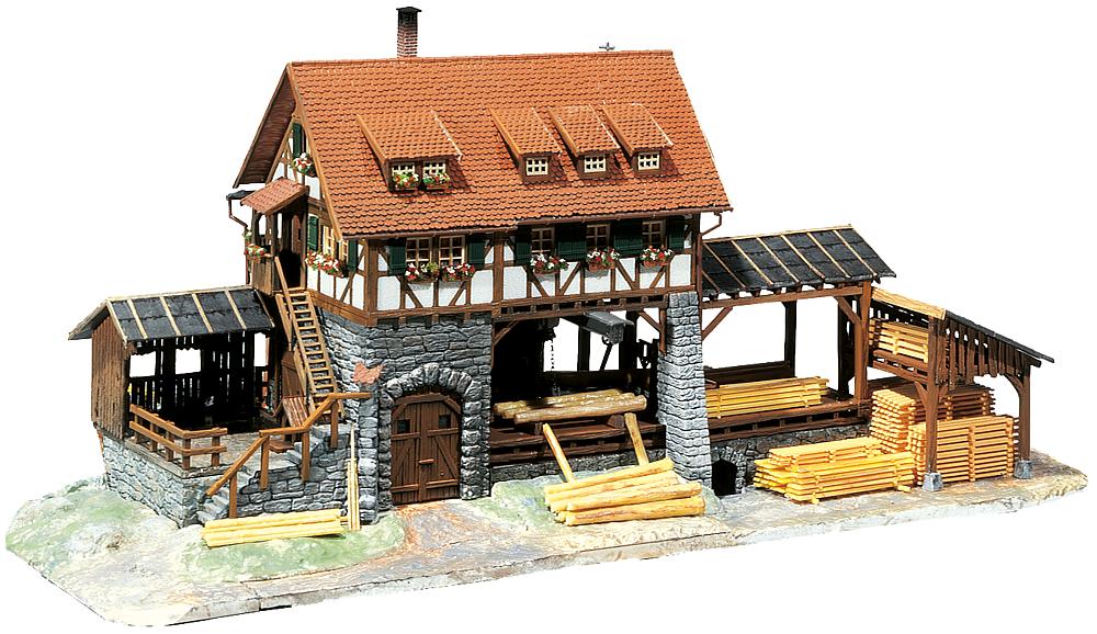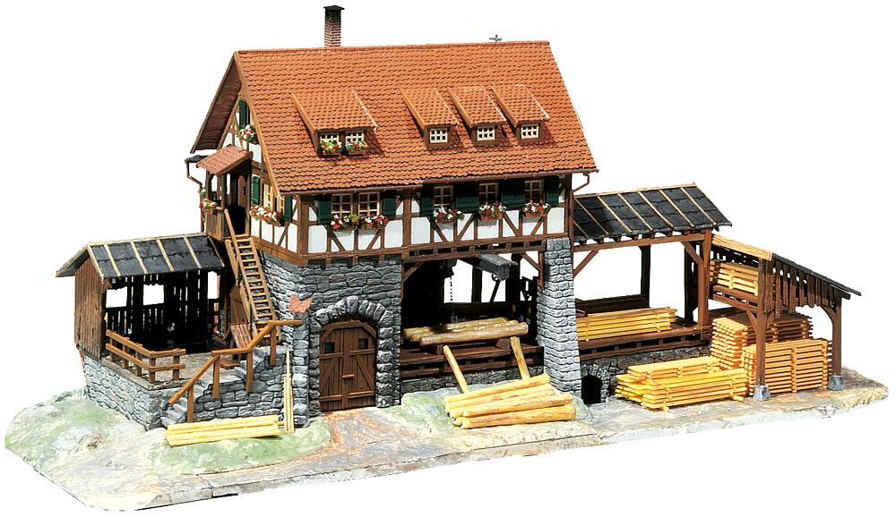 Das Wasserrad wird durch den beigefügten Motor (12 ? 16 V, Wechselspannung) angetrieben, der gleichzeitig auch das sichtbare Sägegatter hörbar auf- und abbewegt. Die offene Bauart erlaubt Einblicke in den Sägereibetrieb. Ein Bretter- und Holzsortiment liegt bei. Das Holzlager kann durch Zukauf der Artikel 180589 und 130288 umfangreich ausgebaut werden. Dieser Bausatz enthält: 569 Einzelteile in 10 Farben, Fensterfolie, 1 Antriebsmotor, 1 Gardinenmaske und 1 Bauanleitung.