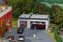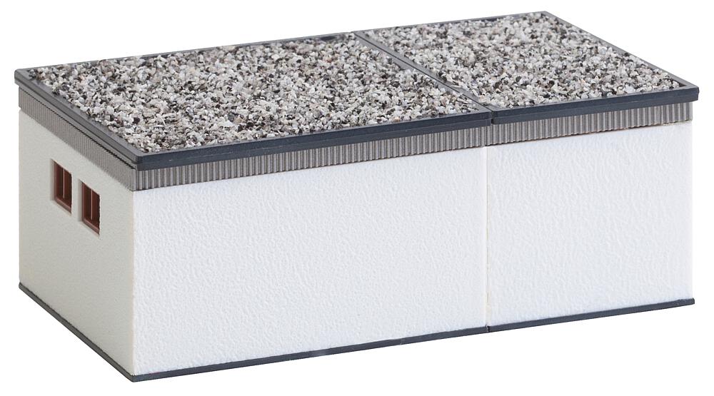 Doppelgarage mit Antriebsteilen. Doppelgarage mit geschottertem Dach und bedruckten Schwenktoren, von denen wahlweise eines über einen separat zu erwerbenden Servo angetrieben werden kann. Tor-Antriebsteile liegen dem Bausatz bei. Maße: 107 x 66 x 40,5 mm