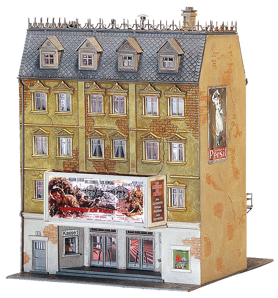 Mehrstöckiges Stadthaus, in dem sich im Erdgeschoss ein Kino aus vergangenen Zeiten befindet. Mit breitem Eingang und Dekomaterial. Dieser Bausatz enthält: 145 Einzelteile in 8 Farben, Fensterteile, 1 Gardinenmaske und 1 Bauanleitung.