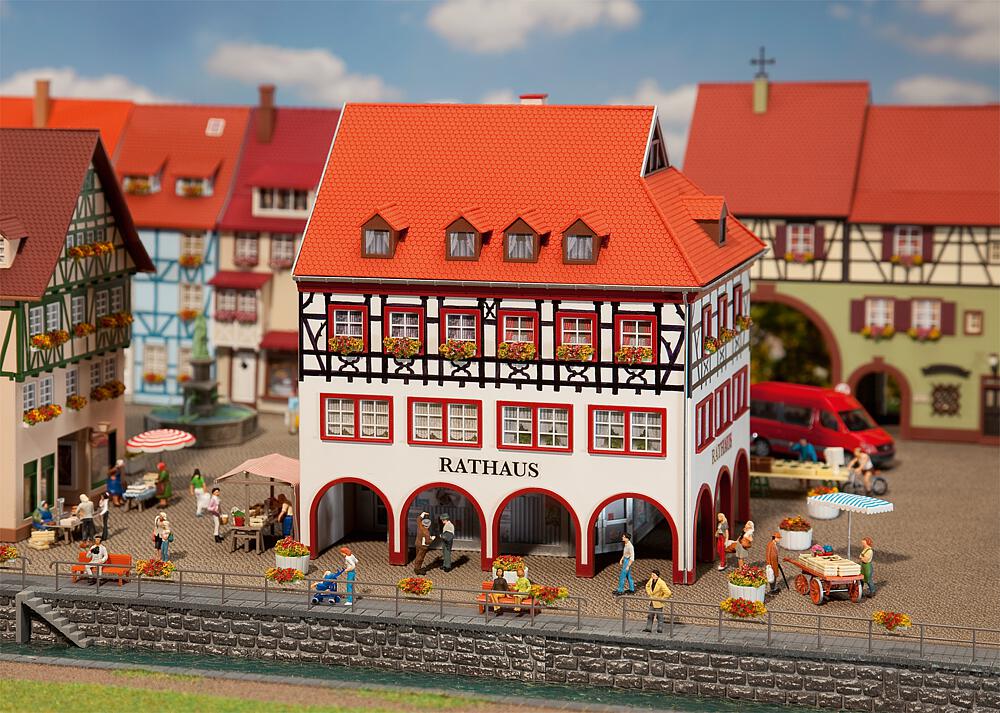 Zweistöckiges, renoviertes Kleinstadt-Rathaus mit über Eck laufendem Arkadengang und dunklem Fachwerk im Obergeschoss. Dieser Bausatz enthält: 197 Einzelteile in 5 Farben, Fensterfolie, 1 Gardinenmaske und 1 Bauanleitung.
