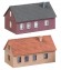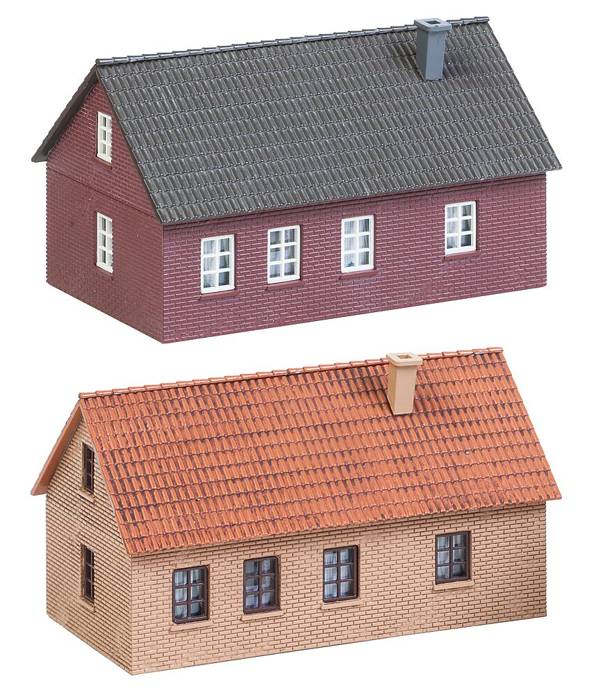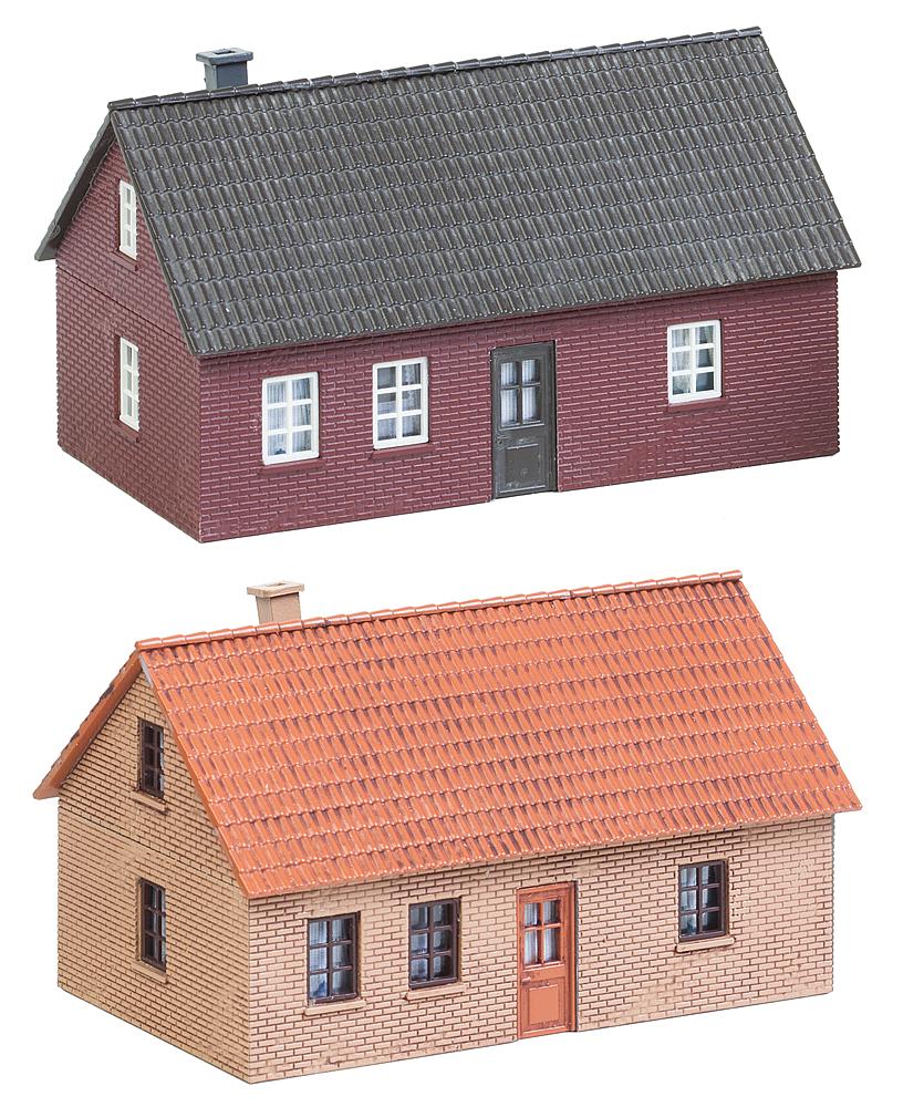 Wind und Wetter widerstehen. Set mit zwei einstöckigen, mit Klinkerfassaden ausgestatteten Häusern mit Satteldach. Die solide Backsteinoptik oder die typisch friesisch-rote Farbgebung orientieren sich an der Architektur Norddeutschlands.