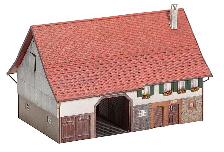 Charakteristisches Einhaus, das Wohn-, Stall- und Scheunenbereich unter einem Dach vereint. Als effektvolles Detail ist das Modell mit Doppelfenstern ausgestattet. Im verputzten Erdgeschoss des zweistöckigen Hofes mit den unterschiedlichen Dacheindeckungen befinden sich eine große Scheune mit Steinboden und Luken zum Stall, ein Schuppen mit geschlossenem Tor sowie ein rückwärtiger Anbau. Stalltür und die Haustür mit dem Schriftzug 1803 sowie verschiedene Fenster im Erdgeschoss besitzen gemauerte Einfassungen. Fassadenakzente setzen u.a. renovierungsbedürftige Eternittafeln. Den Außenabort und einen separaten Eingang zum Wohnbereich im 1. Obergeschoss erreicht man über eine Treppe auf der Gartenseite.