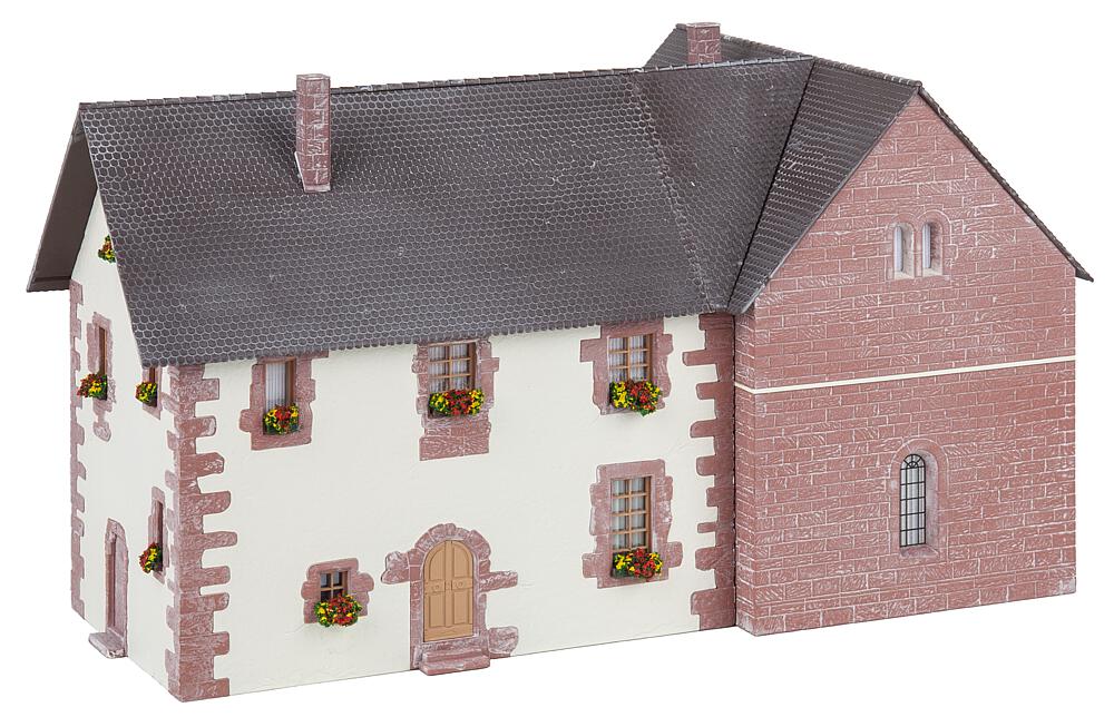 Weingenuss! Patiniertes Modell einer Weinkellerei bestehend aus zwei in L-Form verschränkten, zweigeschossigen Gebäuden mit Außentreppe und überdachtem Außenbereich. Ecksteine, Fenster- und Türgewände der verputzten Gebäudehälfte sind steinsichtig. Als Ausgestaltungselemente liegen Weinfässer, Bottiche und Blumenkübel bei.