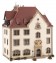 Repräsentatives, dreigeschossiges Gebäudemodell mit aufwändig gestalteten Fassadenelementen, wie gemauerte Fenstereinfassungen, Treppengiebel und Wappenbild sowie einem Fachwerk-Giebelhäuschen.