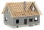 Ein im Entstehen befindliches Einfamilienhaus mit einem passenden kleinen Baukran, das für die H0-Modelleisenbahnanlage der Epoche V