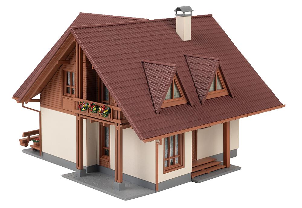Dorf & Wohnhäuser - Einfamilienhaus Rustica - Dieser Bausatz enthält: 230 Einzelteile in 4 Farben, Fensterfolie, 1 Gardinenmaske und 1 Bauanleitung.Verwenden Sie zum Basteln FALLER EXPERT Plastikkleber. - 141 x 124 x 105 mm - Beleuchtung/Elektrik: 1 x 180667