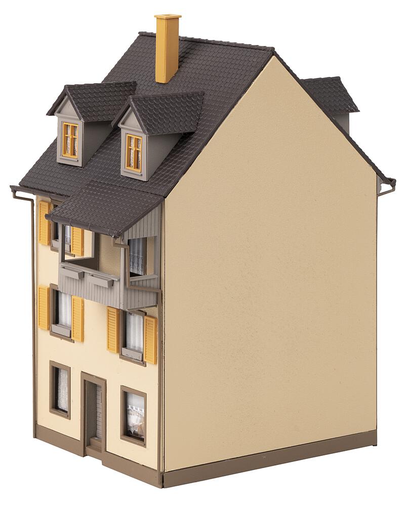Dreistöckiges Wohnhaus mit einem Satteldach, Gauben, einem Balkon und einer Fahrschule im