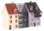 Dreiteiliges Straßenzeilen-Set bestehend aus zwei dreigeschossigen Traufhäusern mit Dachgauben und einem Café mit Markise und Sitzgelegenheiten im Außenbereich. Die beiden Gebäude verbindet ein über vier Etagen reichender Glasbau.