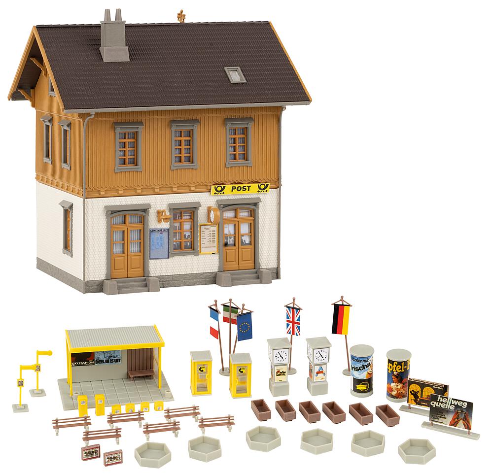 Ländliches Postamt zur Gestaltung einer idyllischen Dorfszene auf der H0-Modelleisenbahnanlage. Das aus der Epoche III stammende Gebäude kommt in einem stilsicher renovierten Erscheinungsbild daher. Passendes Zubehör wie Telefonzellen, Bushaltestellen,