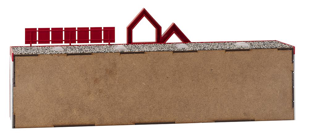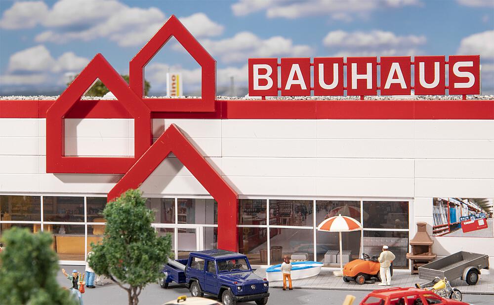 Baumarkt-Reliefmodell aus der FALLER Systembau-Serie mit teilverglaster Front und umfangreicher Inneneinrichtung. Teile und Dekos für die Ausgestaltung als typisierte »Bauhaus«-Niederlassung nach einem Vorbild in Villingen-Schwenningen beiliegend, darunter das großflächige Firmenlogo mit den drei signalroten Häusern, das den Handund Heimwerkern als Eingangsportal zur Filiale dient. Das Modell lässt sich platzsparend an einer Wand oder am Anlagenrand als Hintergrundmodell aufstellen.