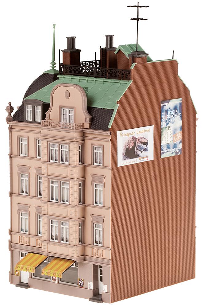 Ein Reihen-Endhaus in 4-stöckiger Ausführung, mit Balkonen, Erkervorbau, Kupferdach und Dachterrasse. Im Erdgeschoss befindet sich ein Ladengeschäft. Das Haus kann in der Höhe variabel gebaut werden, da die Stockwerke einzeln aufeinandergesetzt werden. Dieser Bausatz enthält: 566 Einzelteile in 7 Farben, Fensterfolie, 1 Gardinenmaske, 1 Deko und 1 Bauanleitung.