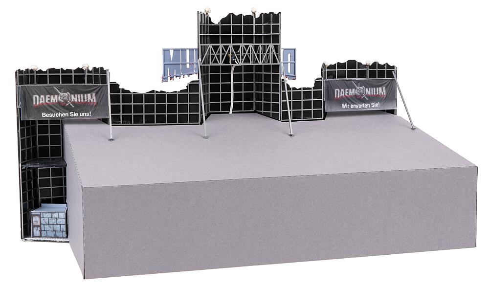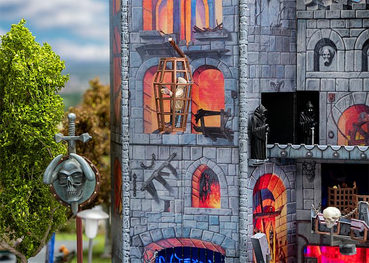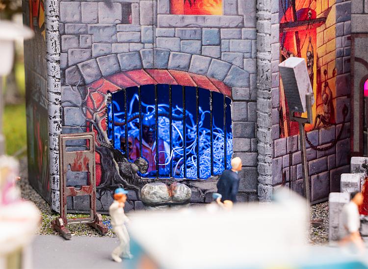 Gruselspektakel im XXL-Format. Digital bedrucktes Funktionsmodell einer großen, mobilen 3-Fahrebenen-Geisterbahn nach dem Originalvorbild »Daemonium« des Schaustellers Martin Blume, einem Fahrgeschäft-Bau des Unternehmens »Mack«. Die eingleisige Fahrt führt in käfigähnlichen Gondeln durch eine bizarre Folterkammer der Inquisitionszeit. Die Dekorationsmalerei der burgartigen Fassade (»Art Studio Bernhardt«), der bewegte Schriftzug und die fantasievoll gestalteten Figuren im Außenbereich zeigen aufwendige Gruselszenarien. 4 Motoren enthalten. Gondeln nicht drehbar.