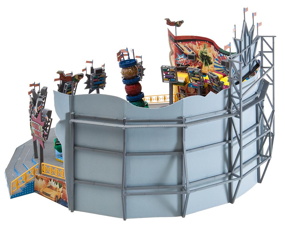 16 bunte Gondeln auf 4 Drehtellern wirbeln wild im Kreis herum. Mit Kassenhaus und farbenprächtiger Hintergrunddekoration. Komplett mit Motor (12?16 V, Wechselspannung). Dieser Bausatz enthält: 402 Einzelteile in 14 Farben, Fensterfolie, 1 Antriebsmotor, 2 Dekos und 1 Bauanleitung.