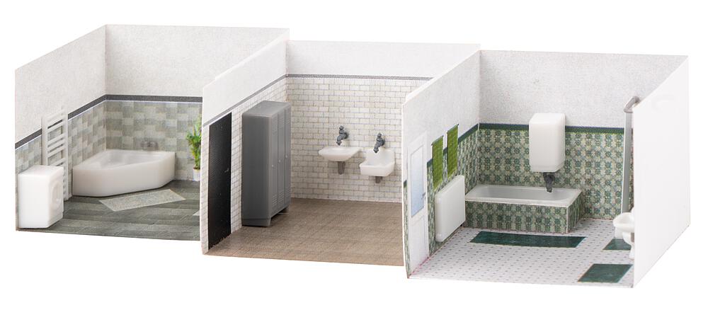 Ausgestaltungsset bestehend aus drei Badeinrichtungen unterschiedlicher Jahrzehnte. Deko und Armaturen beiliegend. Badeinrichtung aus den 2000er Jahren mit Eckbadewanne, WC, Bidet und Waschbecken zur Wandmontage, Handtuch-Heizkörper und Waschmaschine. Badeinrichtung aus den 1970er Jahren mit freistehender Badewanne, Eckduschkabine, Stand-WC, Waschbecken, Boiler und Heizkörper. Werkstatt-Sanitäreinrichtung mit einem Stand-WC mit Spülkasten, 2 Urinalen, Handwaschbecken, Malerwaschbecken und Spind. Die Badezimmereinrichtungen passen zur »Gebäude-Inneneinrichtung«, Art. 180545.