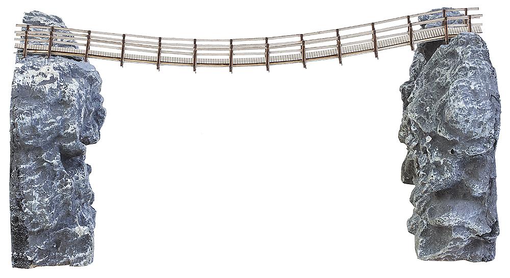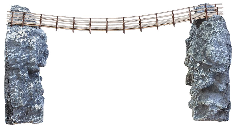 Hängebrücke. Lasercut-Modell einer kleinen Hängebrücke mit einem mit Holzbohlen ausgelegten Brückenweg und Handläufen. Sie überspannt tiefere Gräben oder ermöglicht die Überquerung von Gewässern. Die Brückenlänge ist flexibel baubar. Ein Drahtseil liegt dem Bausatz bei. Maße: 294 x 30 x 30 mm.
