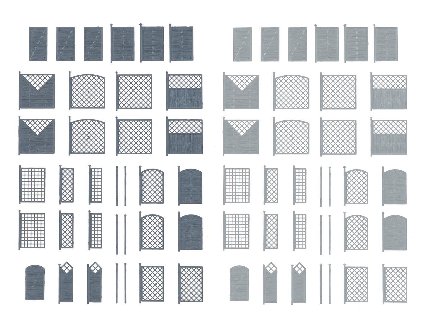 Fein gearbeiteter Sichtschutzzaun in hellem und dunklem Grau, ideal zur realistischen Ausgestaltung von Gärten, Vorgärten und Hausumrandungen. Ob modern oder klassisch - sie fügen sich dezent in jede Szene ein.