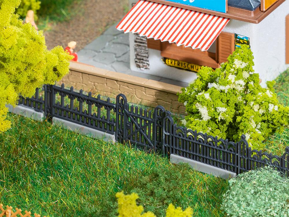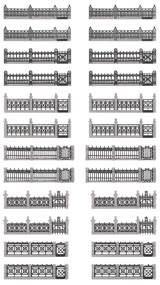 Dekorativ. Ausgestaltungs-Set mit unterschiedlich gestalteten Schmiedezäunen mit Pforten.