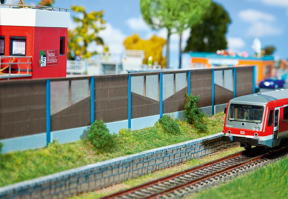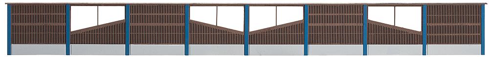 Lärmschutzwand Holz. Modulare Schallschutzelemente aus Holz für den Aufbau an öffentlichen Straßen und Bahnstrecken. Modell mit Stützen und Sockel in Stahl- und Betonoptik. Maße: 270 x 4 x 42 mm