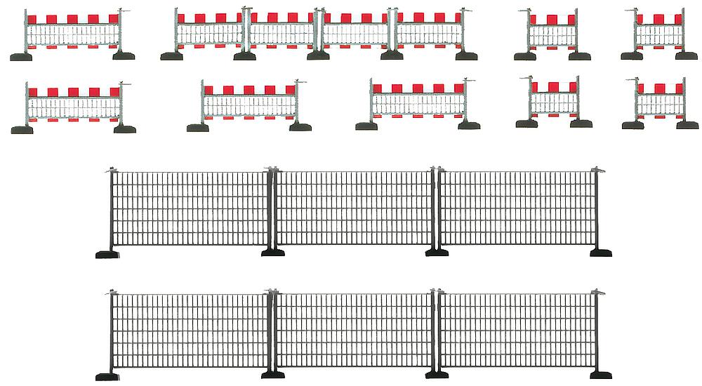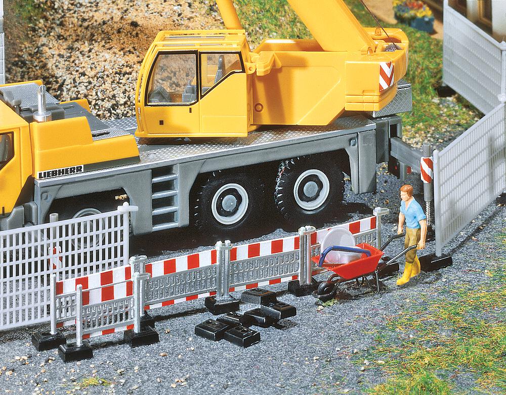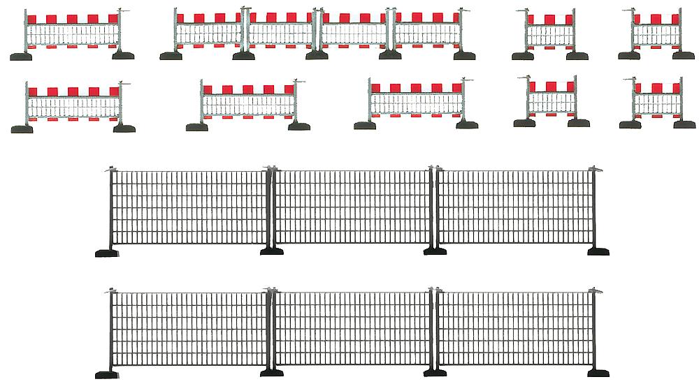 Zum Teil bedruckt, mit Standfüßen, zum Absperren von Baugruben und Baustellen aller Art. Hoher Absperrzaun: Gesamtlänge 240 mm. Niederer Absperrzaun: Gesamtlänge 220 mm