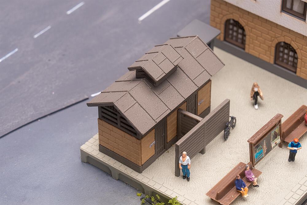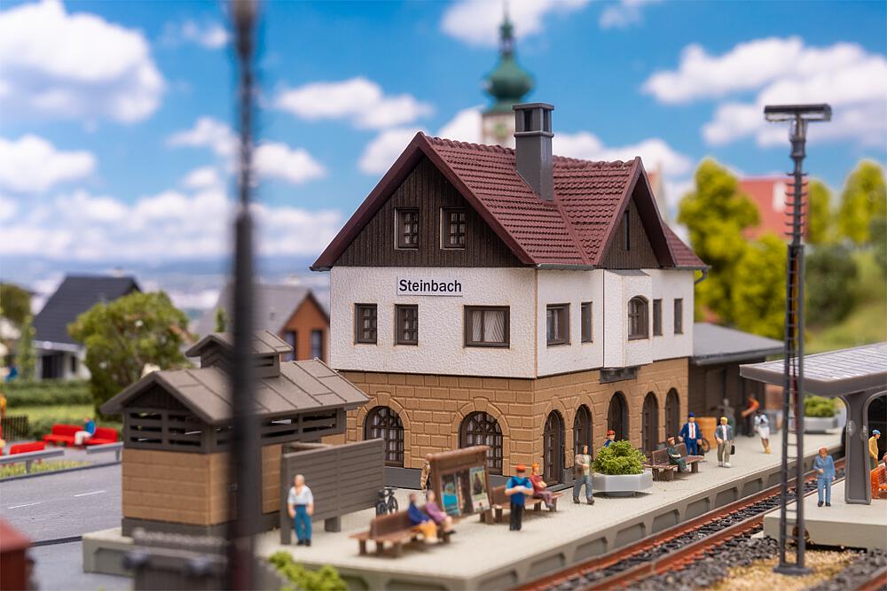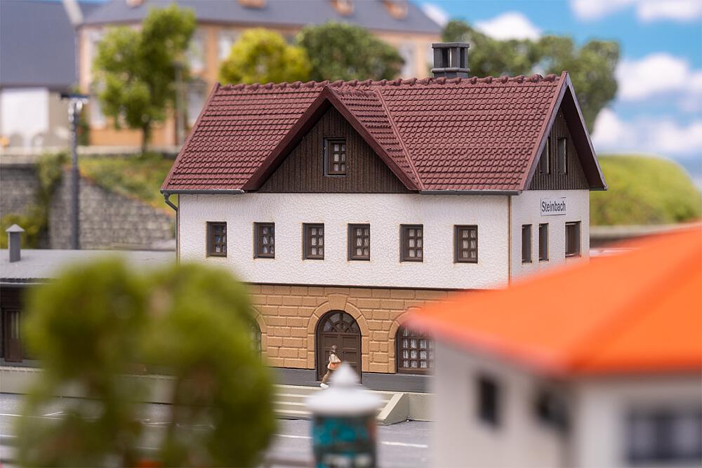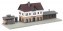 Kleiner charmanter Bahnhof mit Toilettenhäuschen und hölzernem Anbau. Hervorragend geeignet, um eine kleine Stadt mit einem Bahnhof auszustatten. Der Bausatz besteht aus einem Materialmix aus Kunststoff und Holz/Spezialkarton.