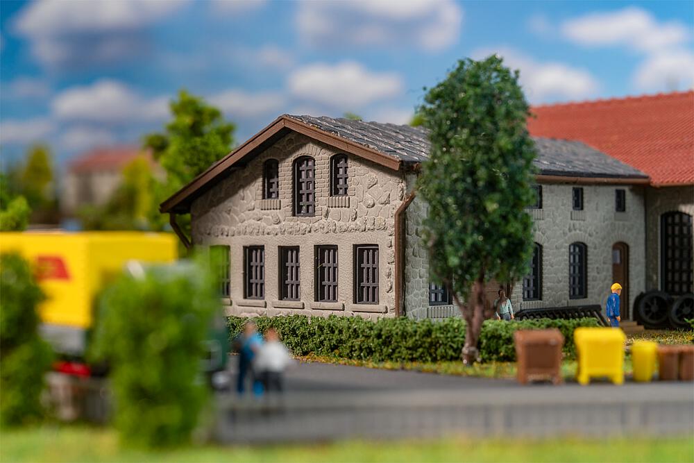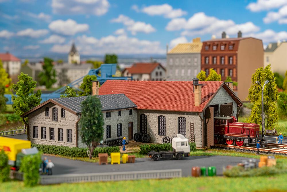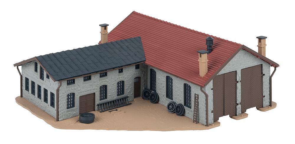 Dieser zweiständige Lokschuppen bietet Platz für gleich zwei Lokomotiven und kommt mit reichlich Zubehör, um die Szenerie authentisch zu gestalten. Die robuste steinerne Fassade verleiht dem Modell einen rustikalen Charme, der durch das rote Ziegeldach perfekt abgerundet wird. Eine echte Bereicherung für jede N-Modellbahnanlage. Geeignet für Loks bis zu 140 mm LüP.