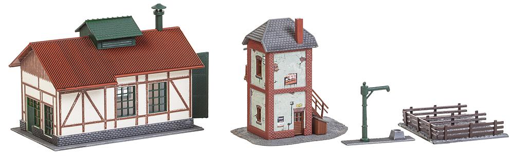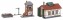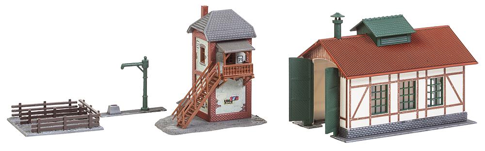 Set Nebenbahnlokschuppen mit Blockstelle. Teilgealtertes Nebenbahn-Set bestehend aus einem Fachwerk-Lokschuppen, einer Backstein-Blockstelle mit Außentreppe sowie einem Wasserkran mit Umzäunung für einen Kohlehaufen. Maße: 90 x 61 x 62 mm, 66 x 45 x 65 mm.