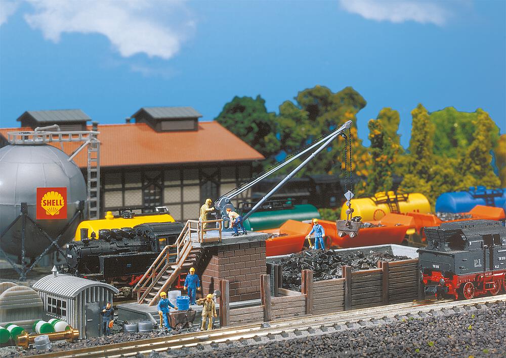 Mit manuell schwenkbarem Verladekran und Kohlewagen (Hunten). Einsetzbar in kleinen Bahnbetriebswerken. Dieser Bausatz enthält: 83 Einzelteile in 4 Farben und 1 Bauanleitung.