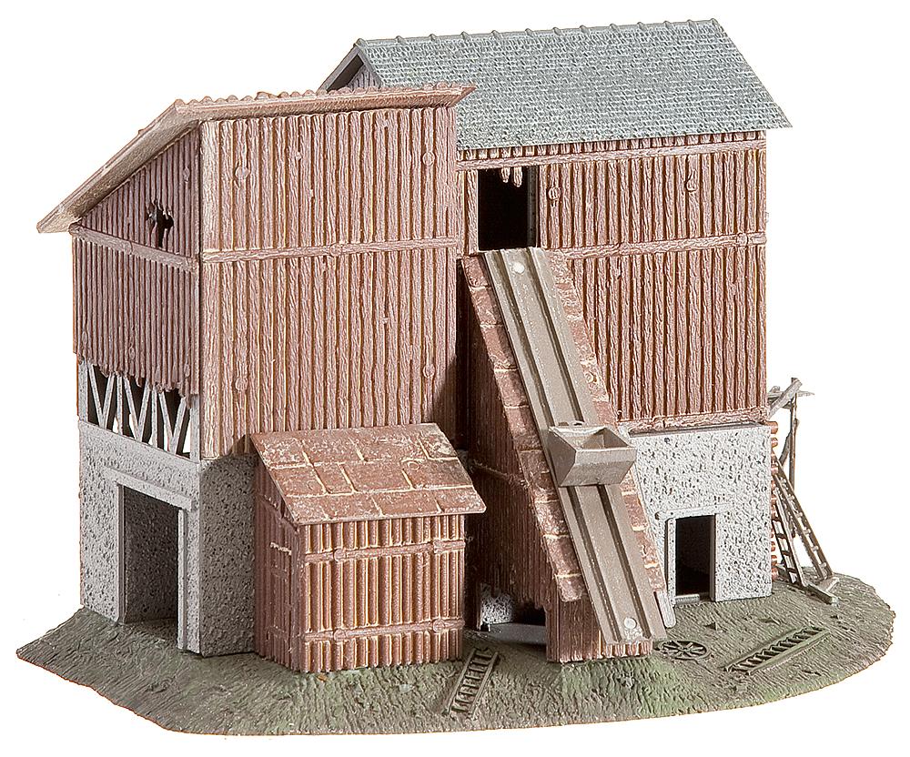 Kieswerk in Holzbauweise mit verschiedenen Schüttvorrichtungen zum Beladen von Fahrzeugen oder Waggons.