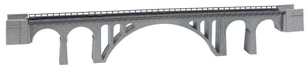 Das gerade Viadukt in massiver Steinoptik besteht aus 2 Brückenköpfen, 2 Viadukt-Oberteilen mit je 1 1/2 Bögen und einer mittleren Bogenbrücke (auch einzeln baubar). Das Viadukt-Set kann einspurig befahren werden und ist seitlich mit einem Geländer gesichert. Das im Original 111 m lange Bauwerk, nahe Guarda in der Schweiz, überspannt mit der 50 m breiten mittleren Bogenbrücke den Bach La Clozza.