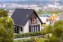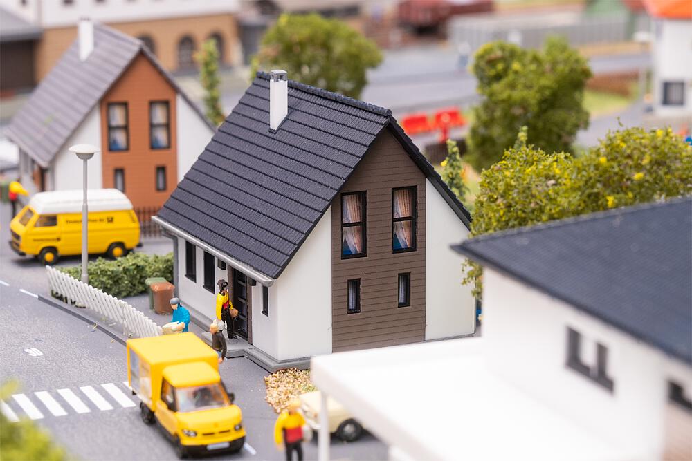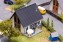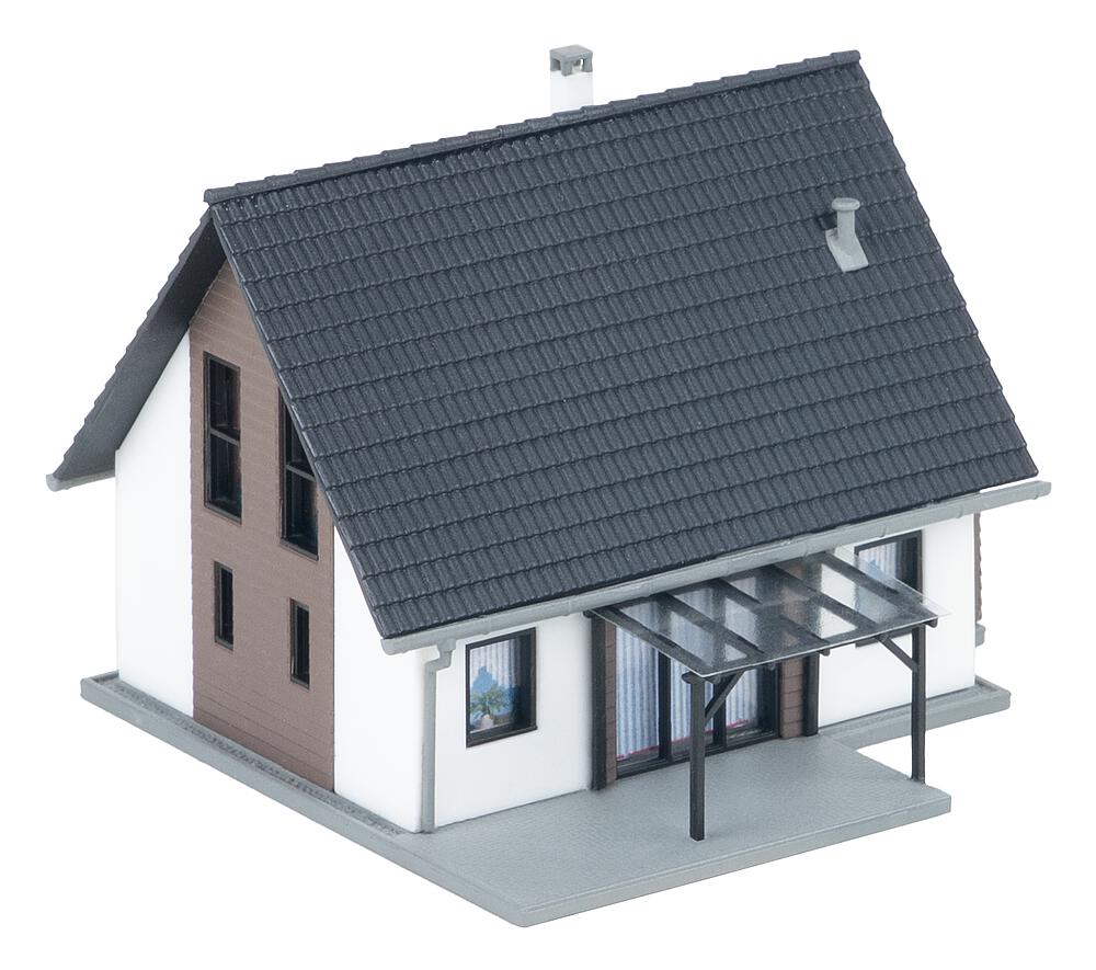 Modernes Einfamilienhaus mit grau-braunen Fassadenelementen, Wintergarten, Terrassenüberdachung und feinem Ätzteilegeländer. Dank durchdachter Konstruktion besonders einfach zu bauen - ideal auch für Einsteiger.