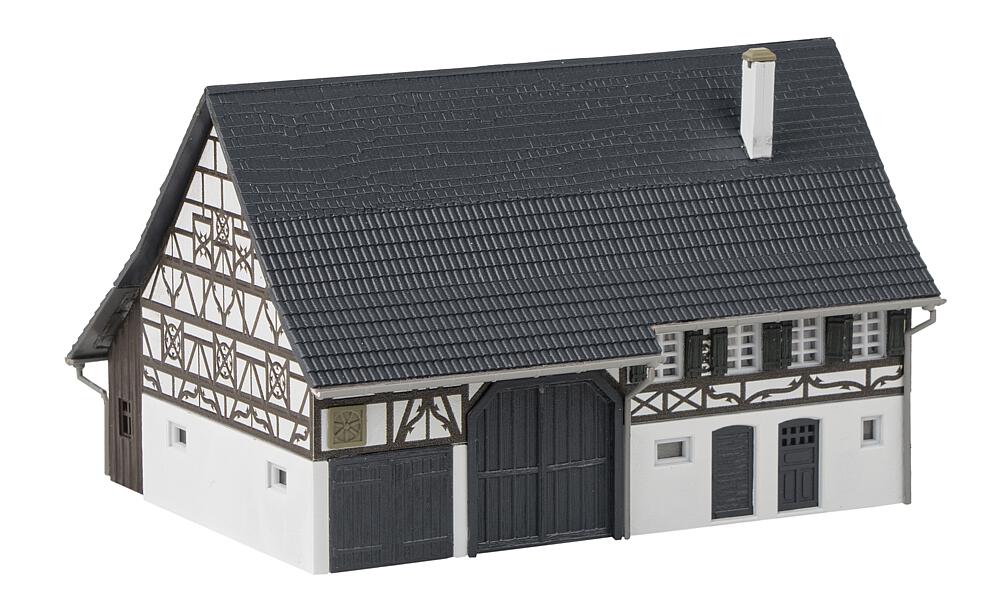Landleben. Zweistöckiges Bauernhaus mit Zierfachwerk und einem Bretteranbau. Stall und Scheune befinden sich im Erdgeschoss. Der Wohnbereich im zweiten Geschoss wird über eine Außentreppe betreten. Als Ausgestaltungselemente liegen ein Außenabort, eine Kellerfalle und ein Wegkreuz bei.