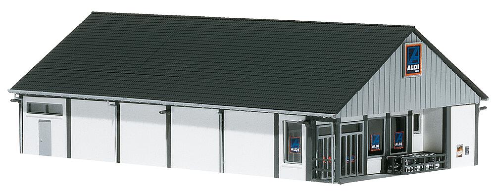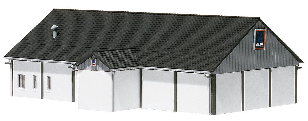 ALDI-Niederlassung aus dem Bereich Süd und Nord, mit Anlieferzone, breitem Eingangsbereich und Dekobogen für Süd und Nord. Dieser Bausatz enthält: 141 Einzelteile in 6 Farben, 1 Gardinenmaske, 1 Deko und 1 Bauanleitung.
