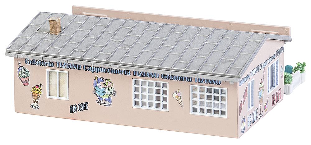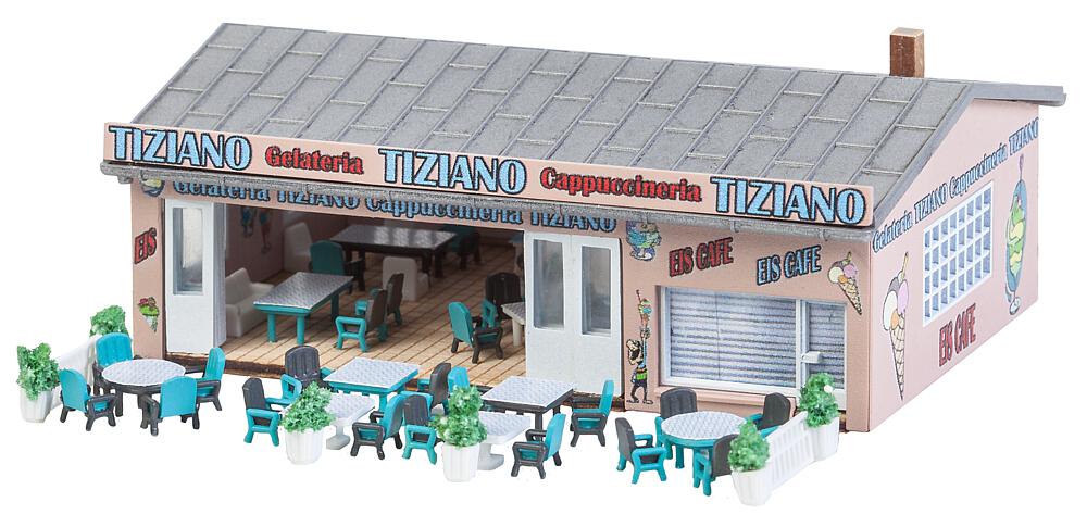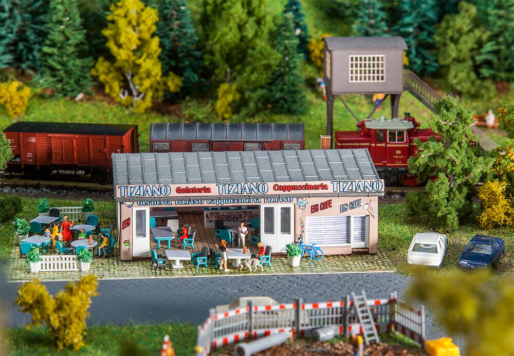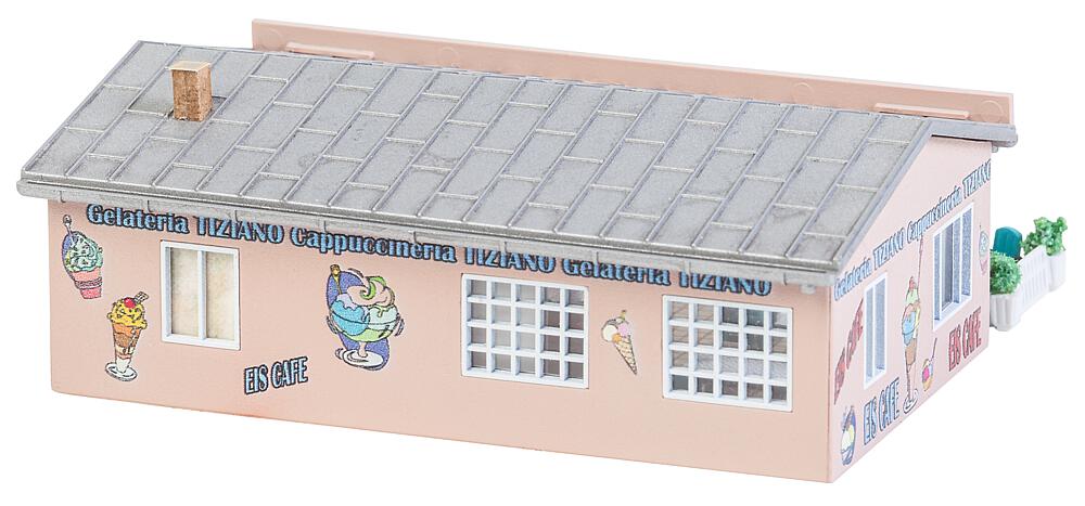 Für die heißen Tage! Modell eines kleinen Eiscafés in einem einstöckigen Gebäude mit flachem Satteldach. Die im Digitaldruck mit bunten Motiven ausgestalteten Fassaden tragen zum fröhlich-belebten Eindruck des Treffpunkts bei. Der großzügige Eingangsbereich kann mit Klapptoren offen gestaltet werden. Zum Zubehör gehören Zaunelemente sowie einladende Tische und Stühle.