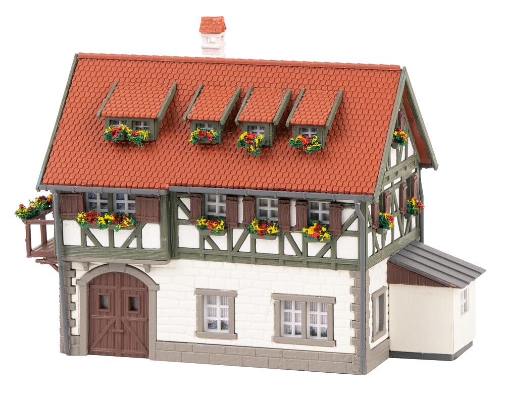 Ländliches, zweigeschossiges Forstamtsgebäude mit Fachwerkobergeschoss, Dachgauben und drittem Giebel. Zur vielseitigen Gestaltung des Modells tragen ein Schuppenanbau, ein Holzbalkon, eine Hundehütte und Blumenkästen bei.