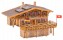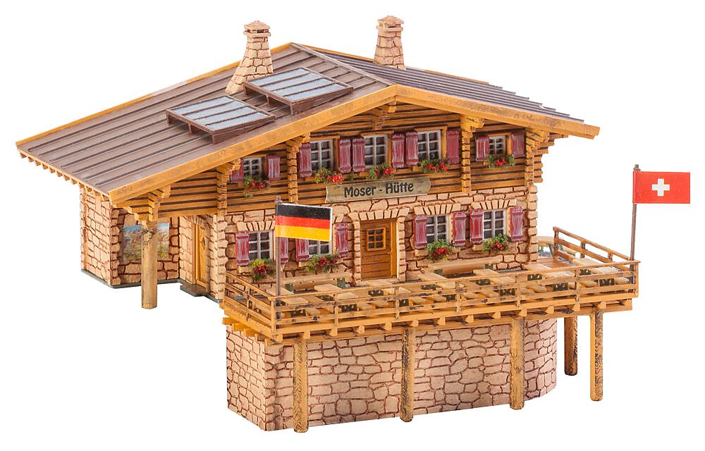 Hochgebirgshütte mit Gipfelkreuz in 2-stöckiger Holzbauweise mit großer, vorgebauter Sonnenterrasse und gemauertem Fundament, ausgestattet mit Tischen, Bänken und Solarelementen auf dem Dach. Die ideale Einkehr- und Übernachtungsmöglichkeit für Wanderer und Skifahrer. Maße: 98 x 69 x 68 mm.