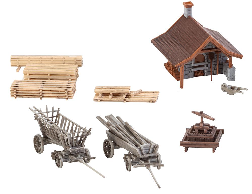 Einfaches Backhäuschen, wie es ehemals oft in dörflichen Bereichen und auf bäuerlichen Hofanlagen vorzufinden war. Zur Ausstattung am Backtag gehören auch eine Weinpresse, Bretterstapel und zwei Leiterwagen. Dieser Bausatz enthält: 120 Einzelteile in 5 Farben und 1 Bauanleitung. Maße Backhaus: 33 x 32 x 30 mm.