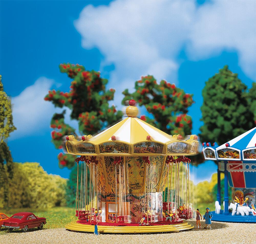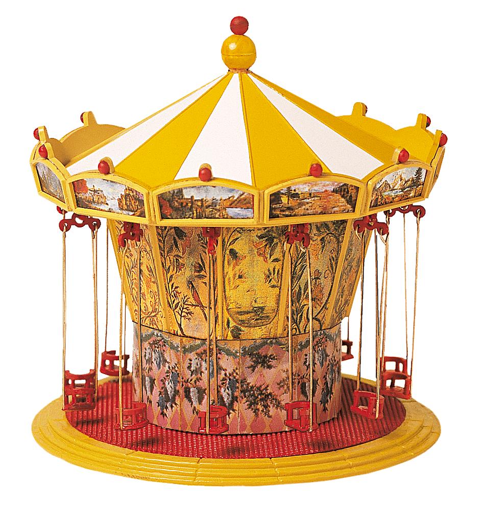 Ausgestattet mit 12 Sitzplätzen, farbig gestalteten Dachsegmenten, aufwändigen Bildtafeln und Bemalungen der Mittelsäule. Das Modell ist komplett mit Antriebsmotor (12?16 V, Wechselspannung) ausgerüstet. Dieser Bausatz enthält: 92 Einzelteile in 3 Farben, 1 Antriebsmotor, 1 Deko und 1 Bauanleitung.